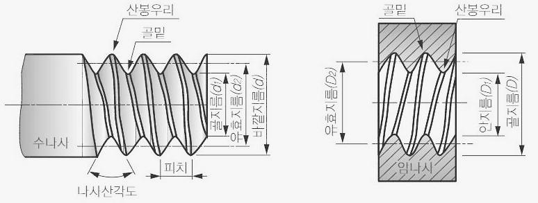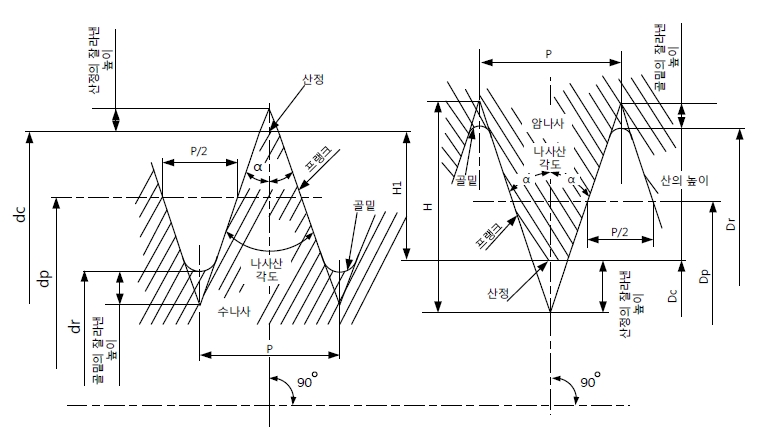 dp :수나사의 유효지름- 이하 d2로도 표기함