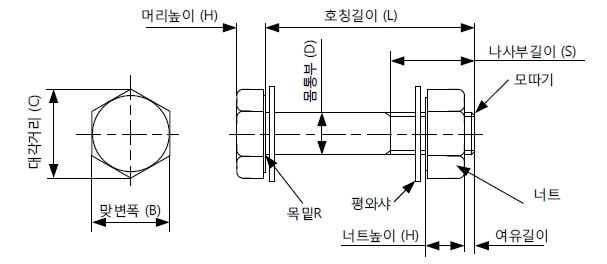 - M10: M 뒤에 나오는 숫자는 나사의 바깥지름을 나타냅니다. 예를 들어, M10은 바깥지름이 10mm인 나사를 의미합니다.