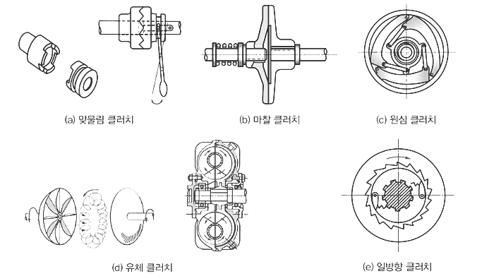 클러치는 운전 중 결합된 축을 분리하여 동력 전달을 단속할 수 있는 장치로, 커플링과는 달리 운전 중 탈착이 가능한 것이 특징입니다. 클러치를 설계할 때는 소형 및 경량으로 관성력을 작게 유지하고, 두 축을 단속하는 데 무리가 없도록 하며, 접촉면의 마모를 고려해야 합니다. 클러치의 종류와 특징은 다음과 같습니다: