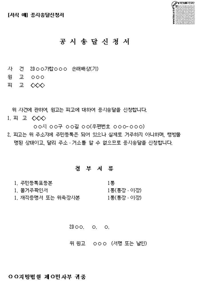 ▶ 민사소송법 제194조(공시송달의 요건) 제1항에는 공시송달을 할 수 있는 조건을 ‘당사자의 주소등 또는 근무장소를 알 수 없는 경우 또는 당사자가 외국에 있는데 송달해봤자 안될 것 같은 경우’로 한정하고 있습니다. 어쨌든 이와 같은 상황에서 법원사무관이 직권 또는 당사자(나)의 신청에 의해 공시송달을 할 수 있다고 되어 있는데요. 다만, 이 신청에는 이러저러해서 도저히 송달이 안된다는 사실을 소명자료로 첨부하여야 합니다.
