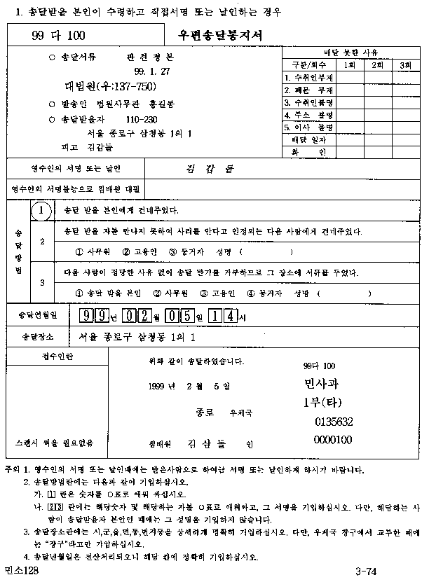 ▶ 팁하나 드리자면, 일단 집행관 송달 신청하기 전에 관할 지역 우체국에 전화해서 담당집배원한테 한번 물어보세요. 그 주소지에 그 채무자(당사자)가 사는지 안사는지, 한번이라도 우편물이나 택배라도 수취한 적이 있는지. 우편물은 안받아도 택배는 받는 경우가 있거든요.