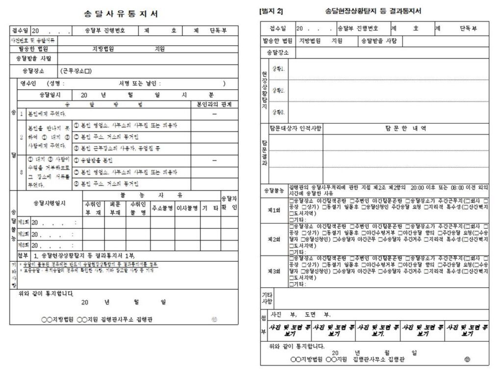 만약 집행관 특별송달로도 송달불능이 되었다면, 집행관사무소에서는 법원측으로 송달사유통지서와 송달현장상황탐지 등 결과통지서를 보내줍니다.