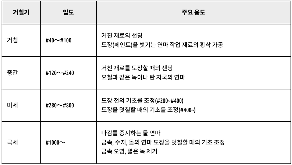 - 중간 입도(중간 숫자) 100~#220 정도의 입도는 중간 정도의 연마 작업에 사용되며, 거친 표면을 다듬고 고르게 만들 때 적합합니다.