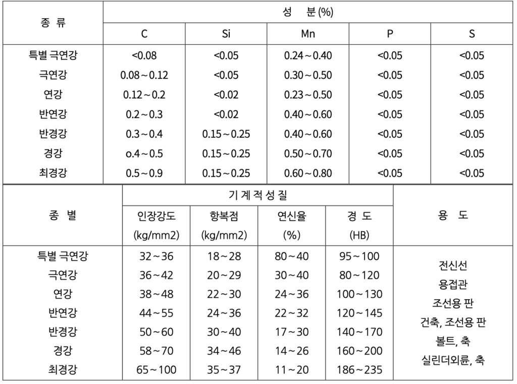 탄소함유량이 C0.08~0.28 정도로 이 범위의 탄소강은 열처리 효과를 기대할 수 없으므로 비교적 강도를 필요로 하지 않는 것에 사용되고 인성이 있으며 용접도 용이해서 일반 기계 구조 부품에 널리 사용된다.