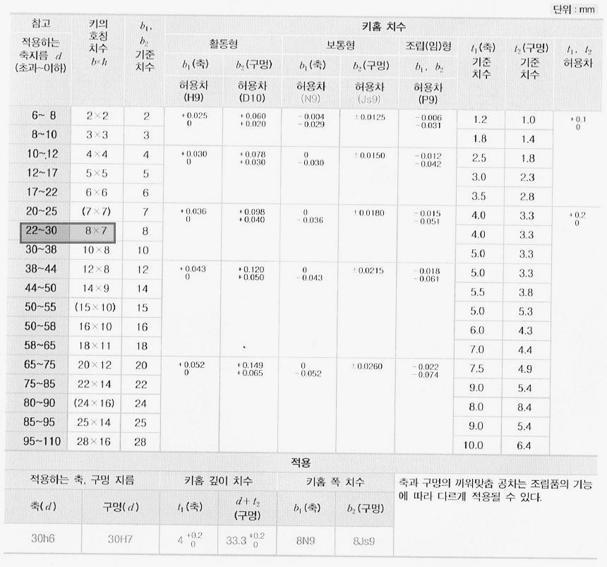 응력 집중 및 피로 파손 방지를 위해서 아무 재질이나 사용해선 안됩니다. 키 홈은 축의 단면적을 감소시키고 응력 집중을 유발하므로, 키 재질이 충분히 강해야 축과의 결합부에서 피로 파손이나 변형을 방지할 수 있습니다.