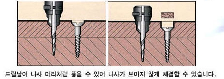 이중기리는 작업 목적에 따라 깊이를 조절할 수 있으며, 육각렌치로 고정하여 사용합니다. 또한, 드릴비트는 항상 수직으로 박고 빼야 하며, 드릴에 장착할 때는 중심축에 맞게 정확히 끼워 흔들림 없이 고정하는 것이 중요합니다. 작업 중에는 드릴의 각도를 잘 확인하여 수직을 유지해야 나사못이 비뚤게 박히거나 목재 표면을 뚫고 나오는 것을 방지할 수 있습니다. 이러한 이유로 이중기리, 사라기리, 접시머리비트 등은 모두 목공 작업의 기본이자 결과물의 품질을 좌우하는 핵심 도구라고 할 수 있습니다.