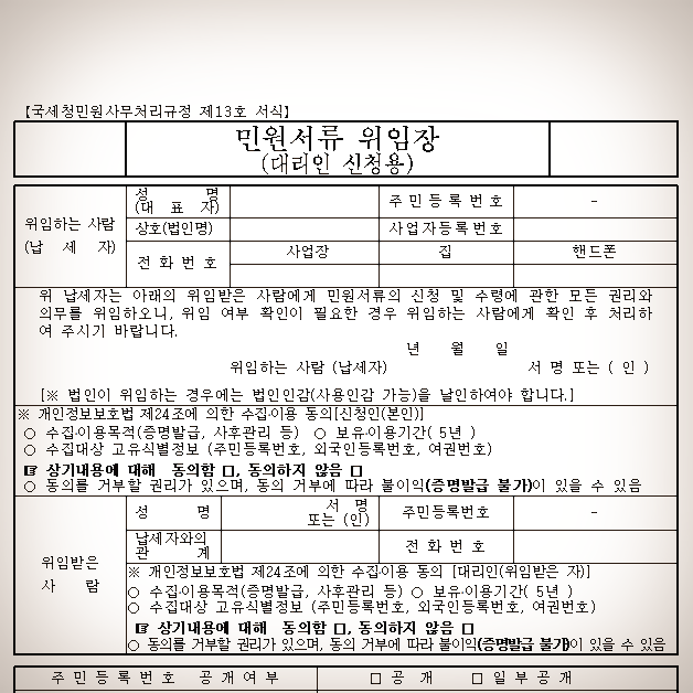 – 연말정산 정보제공 동의 신청서 – 신청인 본인의 신분증 | -연말정산 정보제공 동의 신청서 -신청인 신분증 복사본 -세무서 제출용 위임장(아래 첨부) -대리인의 신분증 |