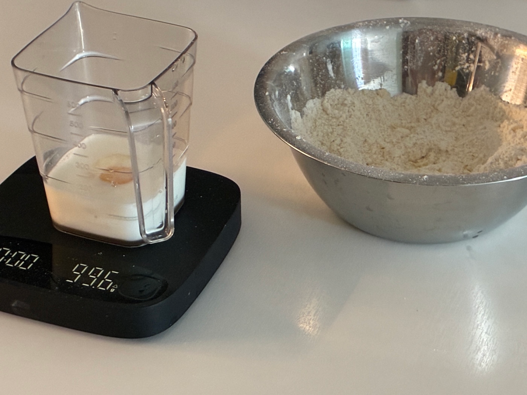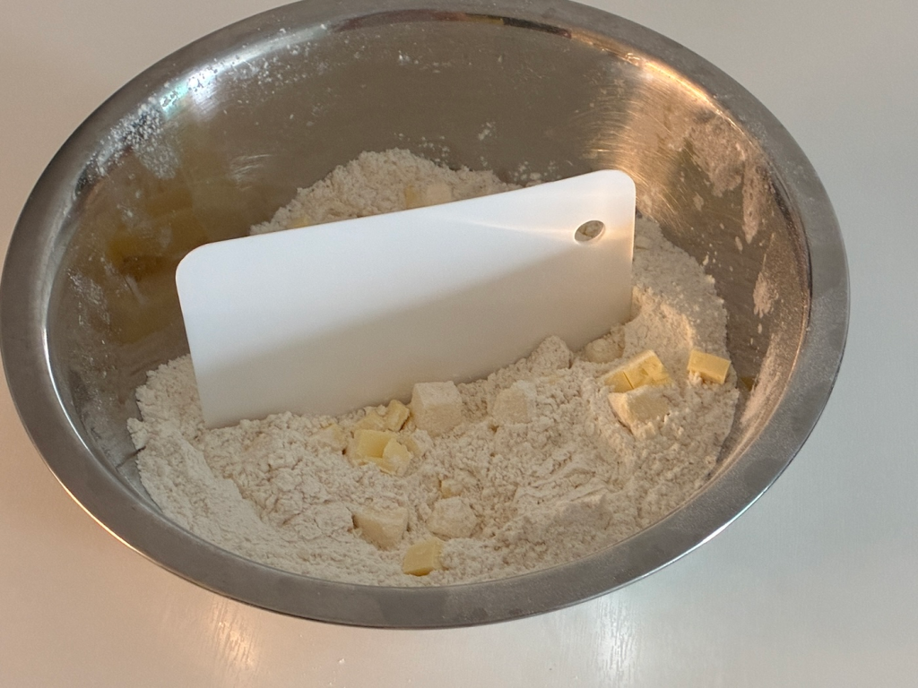 중력분 300g / 설탕 60g / 베이킹파우더 10g / 소금 1g / 차가운 버터 60g / 우유 100ml / 계란 1개