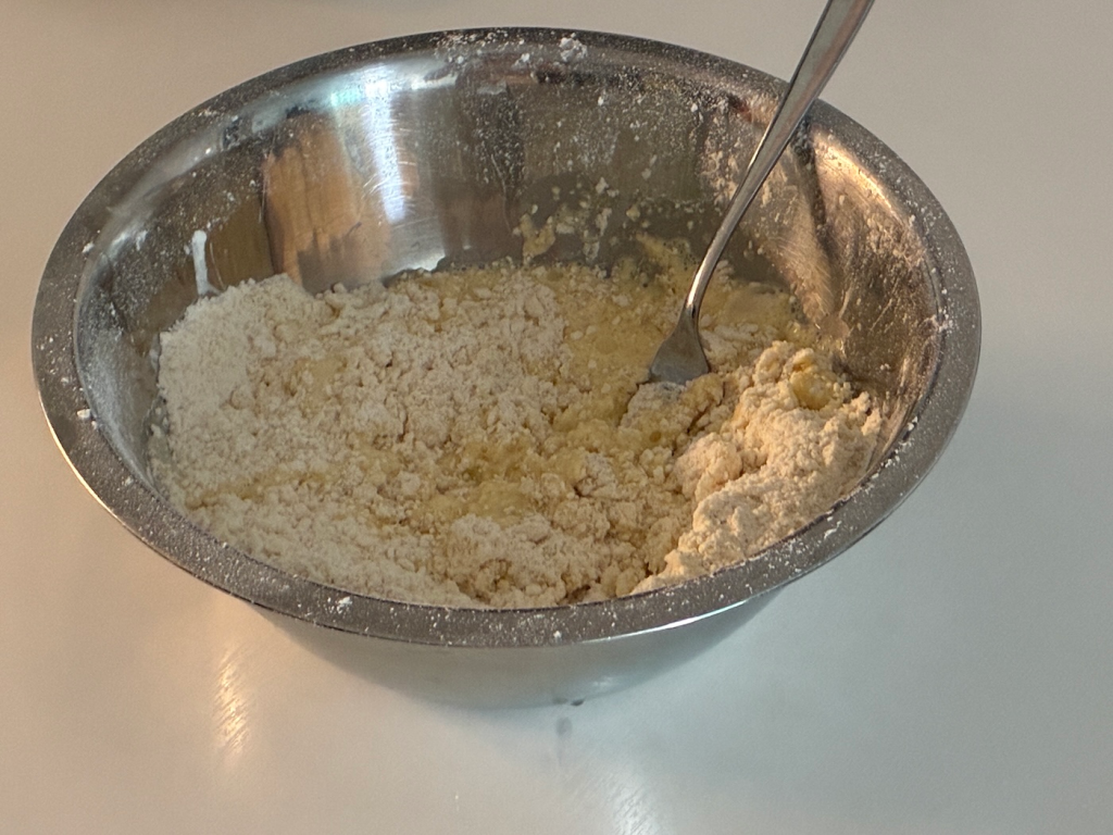 버터와 가루류를 손으로 섞으면 손 온도 때문에 버터가 녹기 때문에 스크래퍼나 포크를 이용해야 합니다. 버터가 녹아버리면 나중에 스콘 구울때 스콘이 옆으로 쓰러집니다. 준비된 우유에 계란을 풀어서 섞어주고 반죽을 합니다. 이때 스콘 위에 발라 줄 계란물 10ml 정도는 남겨줍니다.