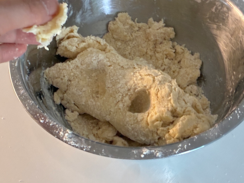 그리고 빠르게 반죽을 뭉쳐줍니다. 온도가 올라가 버터가 녹지 않도록 빠르게 뭉쳐줍니다. 그리고 반죽을 넓게 펴고 반으로 접어서 펴는 작업을 2~3번 반복하고 랩에 싸서 1시간 정도 냉장고에서 휴지합니다.