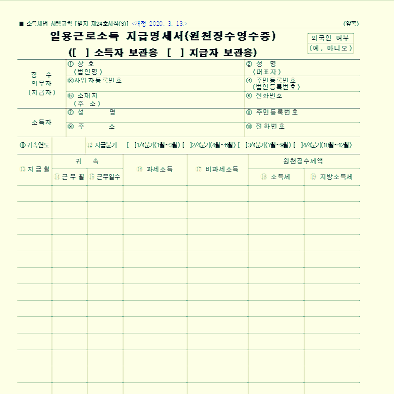 일용근로자에게 급여를 지급할 때에는, 아래와 같은 서식을 2부 작성해야 합니다. 하나는 사업자가 보관용으로 보유하고, 다른 하나는 일용근로자에게 즉시 발급해 주면 됩니다.