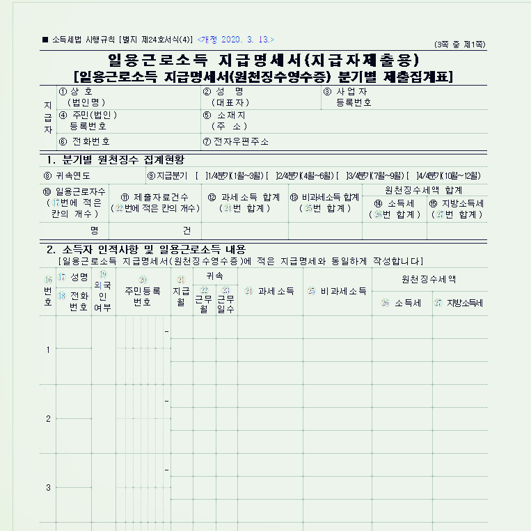 일용 근로소득 지급명세서 지급자 제출용 양식