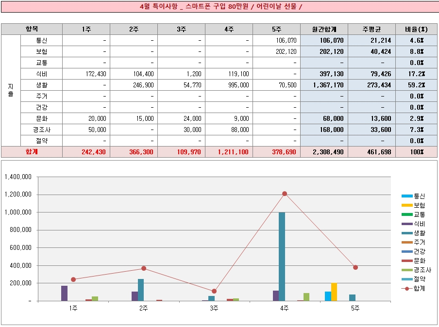 4개월 만에 지출 가계부 작성에도 요령이 생겼다. 탁상달력을 두고 지출을 기록하고 옮겨 적는 방법을 선택했다. 지출이 발생한 날 자기전에 기록하면 잊어버리지 않는다. 4월은 와이프의 스마트폰을 교체로 80만원, 조카들 어린이날 선물로 10만원을 지출했다. 그래도 가정의달을 앞두고 할인폭이 높아서 꽤 많은 금액을 할인받아 저렴하게 구입할 수 있었다.
