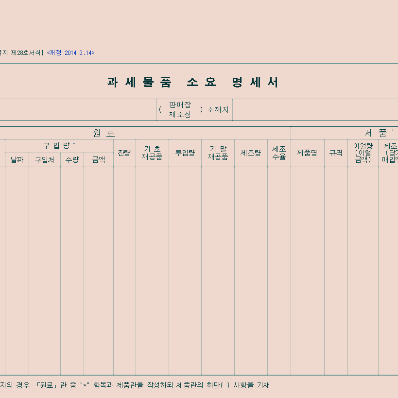 과세물품 소요 명세서는 개별소비세 공제(환급) 신청 시 필수로 첨부하는 증빙 서류 중 하나입니다. 개별소비세법 시행규칙 제15조에 근거해, 개별소비세를 공제(환급)받으려는 사업자는 반드시 해당 명세서를 제출해야 합니다. 이 명세서는 사업자가 실제로 공제 신청 대상에 해당하는 과세물품을 어느 정도, 어떤 용도로 사용했는지 세밀하게 기록한 서식입니다.