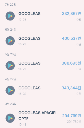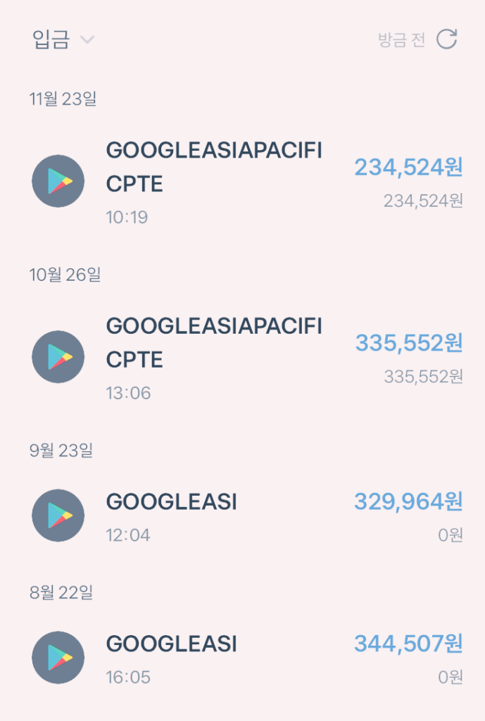 통장내역은 3월 ~ 11월까지 내역이며 1월, 2월 수익은 현재 은행 오류로 정보가 안보이네요. 또 12월분은 다음해 1월에 정산이 됩니다. 대충 평균값으로 이해하시면 될 것 같습니다. 최근 환율 기준으론 대략적으로 35만원정도가 한달에 발생하는 구글 애드센스 평균수입인 것 같습니다.