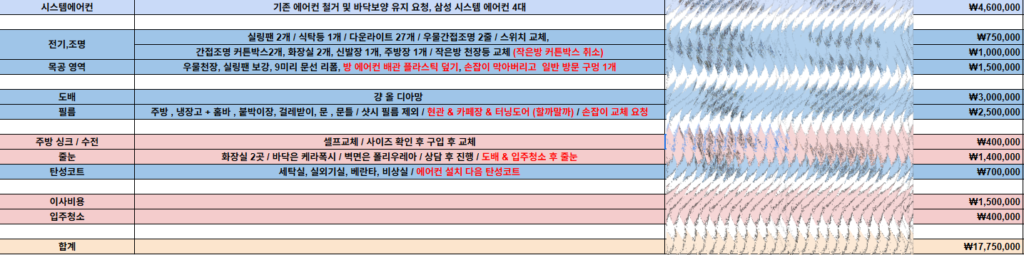 공사 소음 동의서 – 바닥 보양 – 시스템에어컨 – 탄성 – 전기 & 목공 – 필름 –