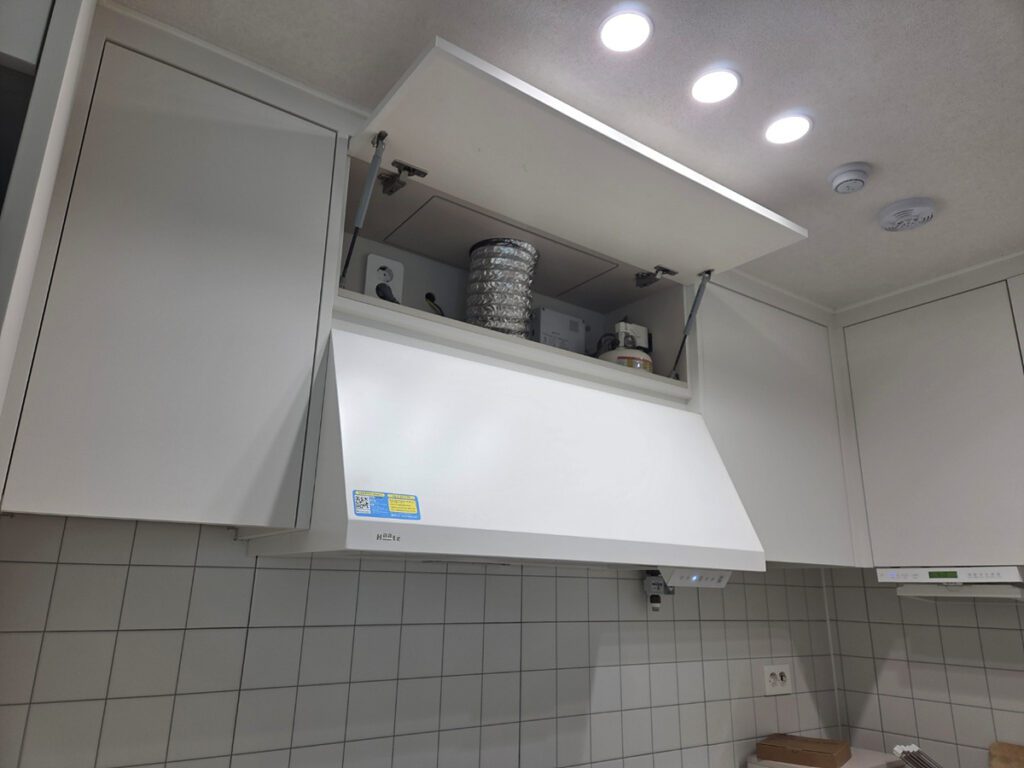 우리집도 이 집이랑 똑같이 이렇게 설치돼 있었다. 대부분 더샵아파트가 이런 방식으로 설치된 것 같은데 이게 문제가 아주 심각하다. 일단 휀에 기름이 끼거나 문제가 생기면 수리하는게 너무 힘들다. 보통은 주방후드 안에 설치된 휀만 교체하던가 휀만 분리해서 청소하면 끝나는 문젠데 이게 일을 복잡하게 만든다.